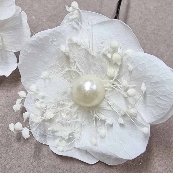 Con las flores preservadas, trending topic mundial, la hortensia y la paniculata, acabando con una perla central, ideales para novias o invitadas; las puedes pedir en diferentes colores, combinando con tu vestido, resaltando así tu peinado con horquilla con paniculata y hortensia.