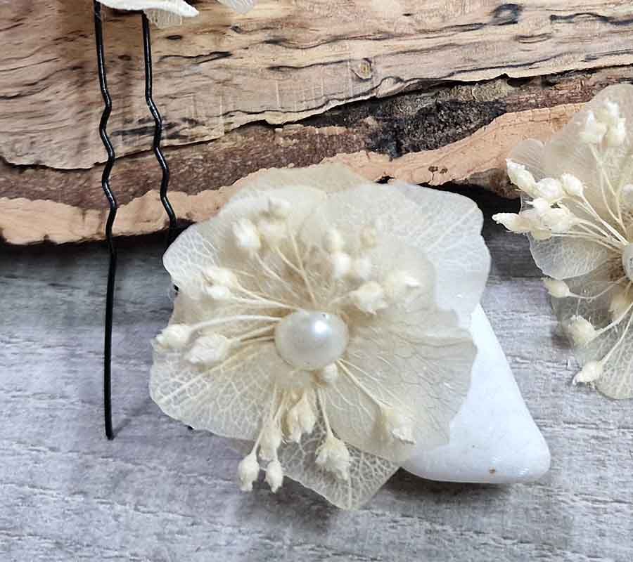 Horquillas de hortensia multicolor preservada. Las prácticas horquillas perfectas para sujetar el pelo en moños, trenzas y recogidos, que con las flores preservadas pasan a ser el adorno para el pelo más vendido.