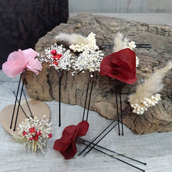 Horquillas, Flor Rosa y Burdeos. Set de 5 horquillas de flores surtidas para el pelo, recogidos y moños perfectos para los peinados más actuales, para las novias o invitadas, colores frescos que podemos combinar a conjunto con tu ramo. El blanco con rosa y burdeos, presentados en set de cinco horquillas surtidas. Son un adorno floral muy versátil: horquillas, flor rosa y burdeos