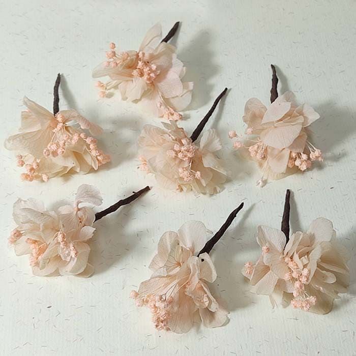 5 Hortensia Rosa Para el Pelo Hecho a mano para el pelo de las novias con flor de hortensia color rosa nude preservada. Son ideales para darle un toque especial, sutil y romántico a tu peinado. El diseño del peinado de la novia y los pins de flores, le permiten a ti peluquera hacer auténticos peinados creativos y exclusivos para la novia. También por supuesto pueden lucir las flores las invitadas a bodas y son geniales para las niñas de comunión