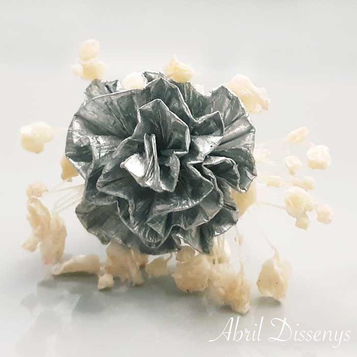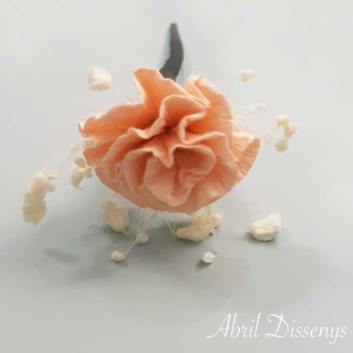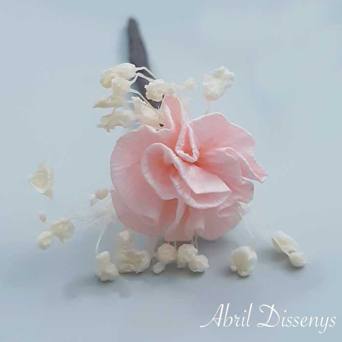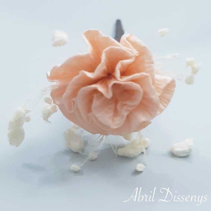 Surtido 5 Flor Preservada para el Pelo. Comprar estos pequeños grupos de florecillas para adornar el pelo, con la cantidad que necesites La sencillez y la elegancia que aporta a tu pelo, a tu peinado, flores de la colección, flores sueltas en el pelo, secas y preservadas, en colores, cava, burdeos, verde, blanco o blanco roto. Con los Pins de Flor de Abrildissenys, conseguirás un peinado perfecto para ir de celebraciones tanto si eres la novia como la invitada.Pin con Clavel y PaniculataIdeal para adornar los peinados de novia y de niñas de comunión ¿Por qué vienen en set de 5 unid? En floristería es básico que el número sea impar para que la posición no cuadricule. Colección: Clavelitos Producto: Pin de Paniculata y Clavel Set de 5 Realizado: A mano al 100 % Tamaños: Flor 2 x 3 de diámetro Tallo 7 largo. Elaborado con: Clavel hecho a mano con papel especial, flores secas y preservadas paniculata. Enteipado a mano. Duración: Indefinida. Práctico, ya que su tallo se retuerce con facilidad Colores: Beige, blanco, camel, lila, coral, salmón, rosa claro, burdeos, marrón, turquesa, azulón, azul marino. Origen: Badalona Barcelona España