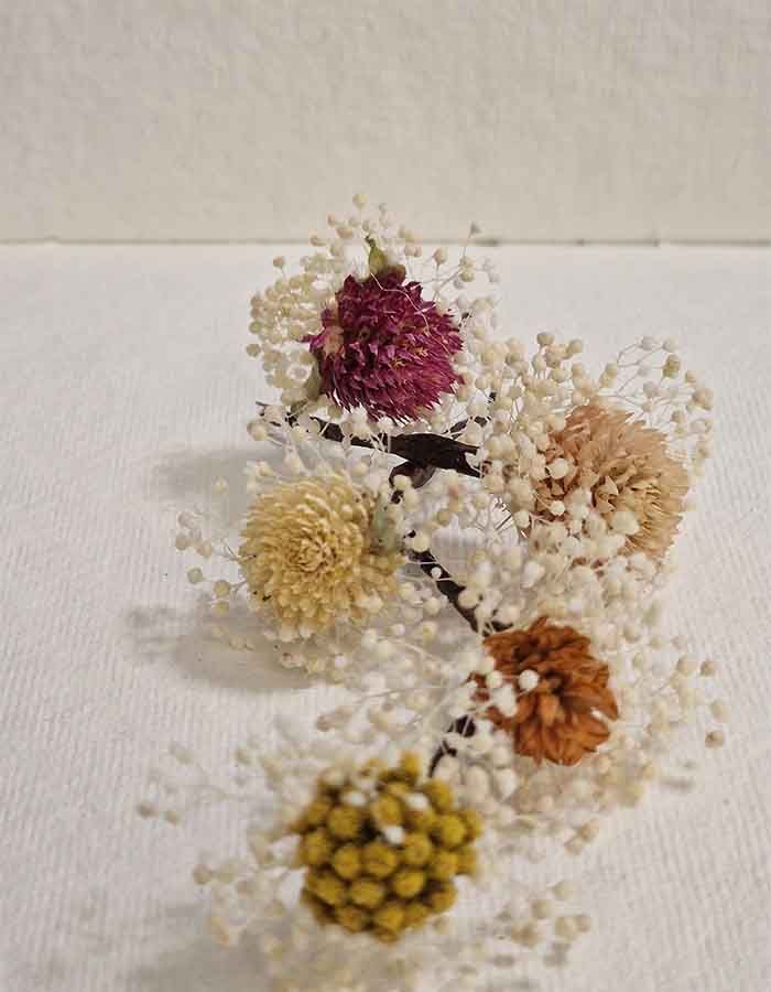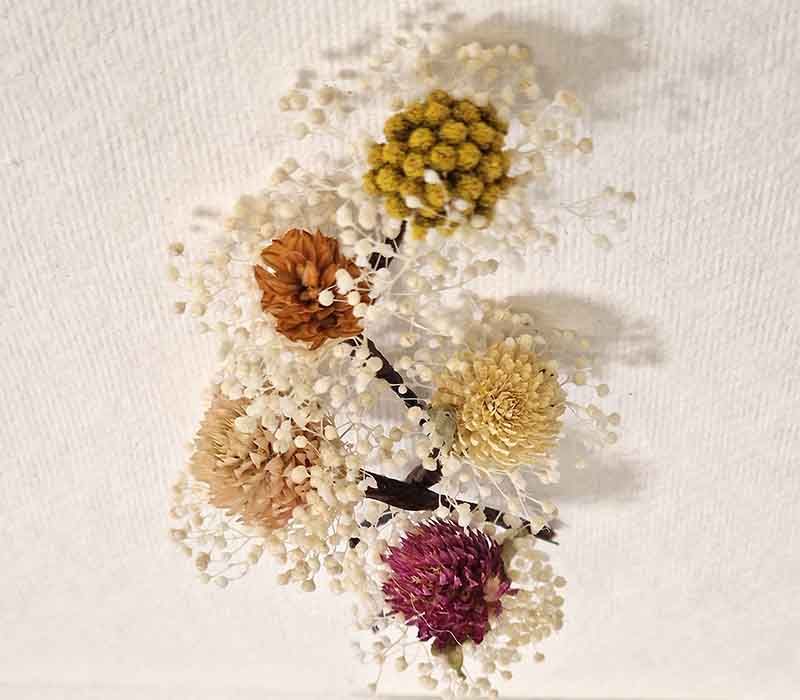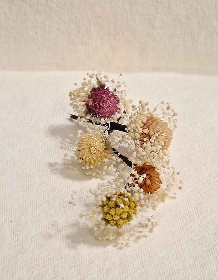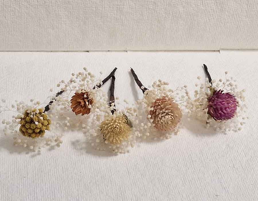 flores sueltas en el pelo, secas y preservadas, en colores, cava, burdeos, verde, blanco o blanco roto. Con los Pins