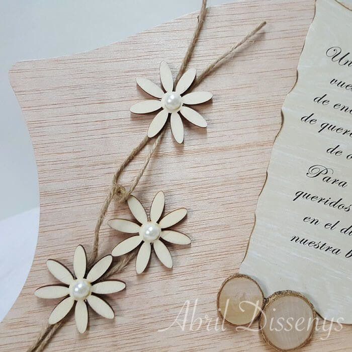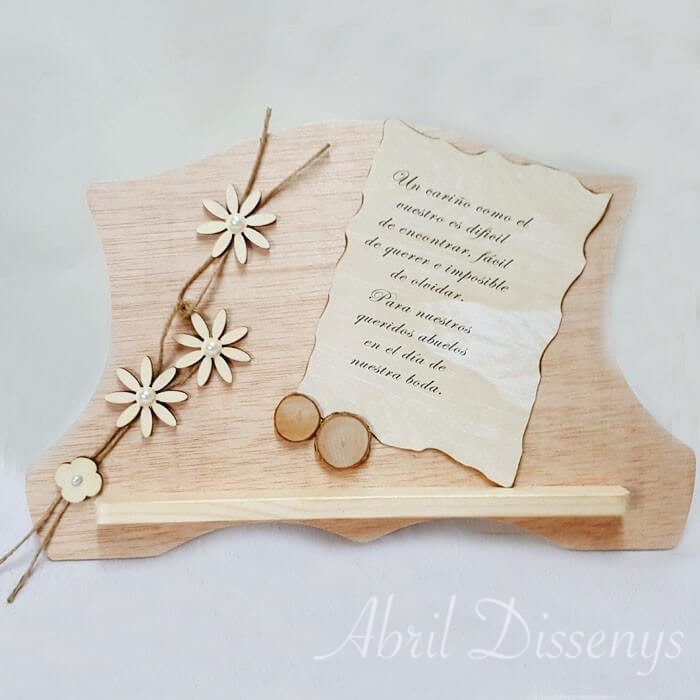 ElAtril decorado palabras de agradecimiento. Lo personalizamos según el evento inolvidable detalle para padres de los novios yo personas muy especiales, para los invitados estrella de la celebración, los padres, abuelos con palabras de amor. El atril de marquetería de madera de natural, esta decorado con flores de madera, cuerdas de yute y rodajas de madera para personalizar.Expresar tu Amor Sentimientos