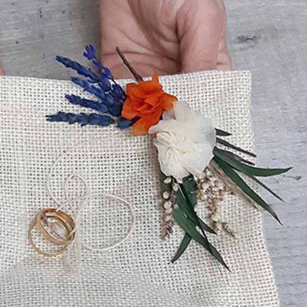 Materiales: Yute natural texturizado, flores preservadas.