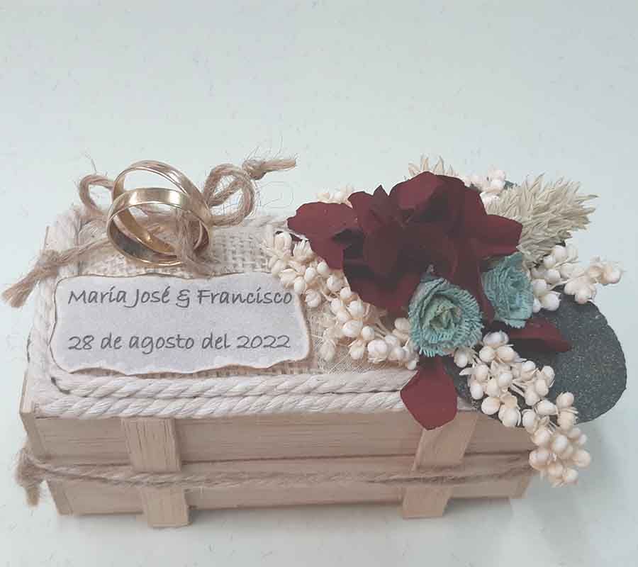 Tenemos diferentes opciones de decorarlo con las flores a tu gusto, lo recibirás personalizado con vuestros nombres y fechas de la boda al tu estilo de boda. ¡Otras opciones para llevar los anillos!! Bandejas, cestas, Aros, rodajas de madera, cojines, cajas de maderay mil ideas más para qué vosotros, llevéis vuestras alianzas y arras más espectaculares.
