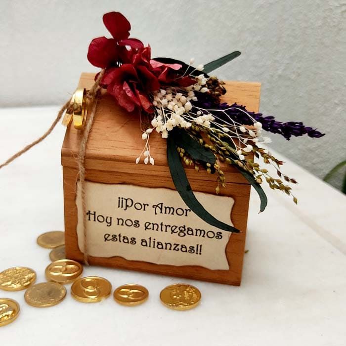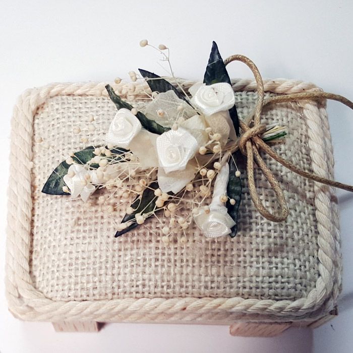 El perfecto porta anillos y arras para boda. Compra para tu boda el baúl de madera de marquetería, está decorada con flor seca y lazos de puntilla en algodón. Es un diseño rústico, romántico y práctico.