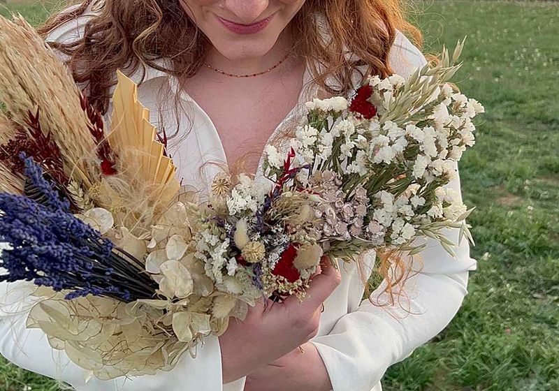 Nosotros apostamos por las flores preservadas y secas. ¿Por qué? Porque te permiten disfrutar de la belleza natural sin nervios. Tu ramo estará perfecto desde la primera foto de la mañana hasta el último baile de la noche (y durante años en tu casa).3. Menos es más, pero con intenciónNo necesitas inundar el espacio de flores. Es mejor tener pocos puntos de atención pero que sean coherentes.El truco: Si llevas un adorno de flores en la cintura, intenta que los clips del pelo de las niñas de arras o el porta-alianzas tengan exactamente el mismo tipo de trabajo manual. Esa repetición de texturas (yute, lino, encaje) es lo que crea un estilo "vintage" y personal de verdad.