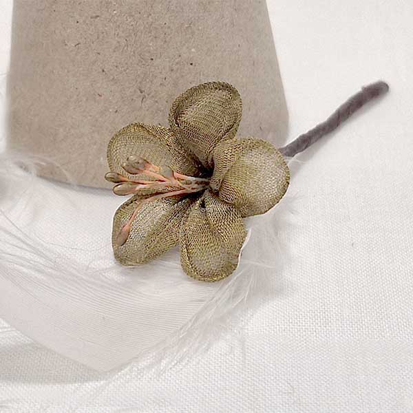 Alfiler de Flor y Pluma. La diferencia es una preciosa flor metálica color cobrizo con una pluma de marabú, algo diferente en nuestros alfileres, para seguir con la tradición, pero con otro aire, especialmente original siguiendo el estilo de tu boda clásica, flor de fina tela metálica acompañada de una pluma blanca de marabú que le aporta luz. Un detalle muy femenino que no puede faltar en la boda, la novia repartan sus alfileres, es como repartir un retal de su felicidad. Alfiler de Flor y Pluma