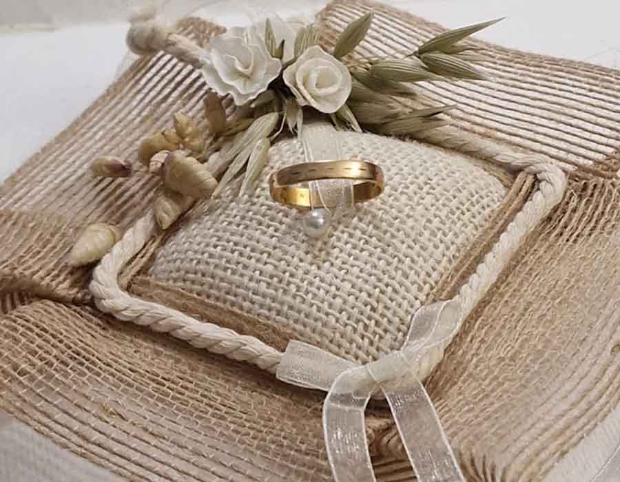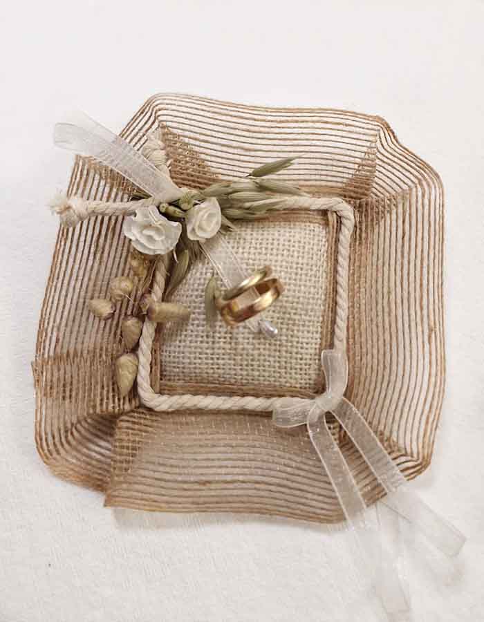 Almohadón Mini para los Anillos. Cojines pequeños donde puedes poner una o dos alianzas, quedaran perfectamente seguras para llegar al altar, con una preciosa decoración a base de flores preservadas naturalmente. Suficiente para las parejas que solo tienen un niño o niña porque las das alianzas están perfectamente juntas.