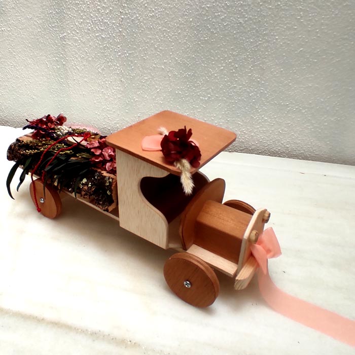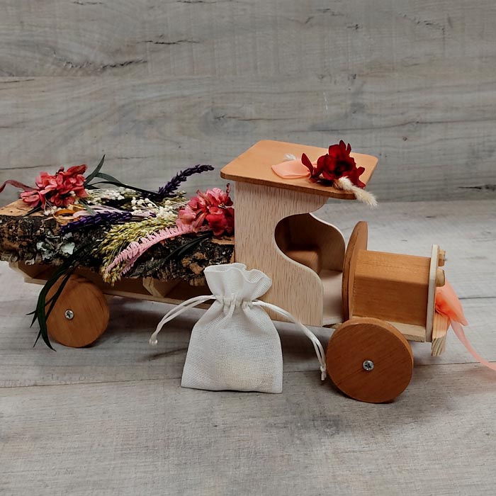 Flores preservadas: Eucaliptus, mijo, dudímea, flor de lavanda, blomme y Pampa. Lleva una cinta a conjunto de 1.30 cm, para que los niñ@s de arras puedan tirar de ella y el camión rodando se desplace a su ritmo.