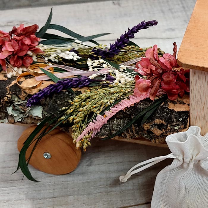 Realizado con madera y flores preservadas preparado para llevar las alianzas al altar o las arras o si solo tenéis un paje o damita os recomendamos el camión combi ya que el camión lleva un remolque preparado para las arras. Utilizamos maderas recicladas y productos de la naturaleza. Los anillos van sobre el el centro de flores preservadas sobre un tronco de madera rústico que está pensado para que puedas utilizarlo como centro de mesa. ¡¡Después de la boda¡¡ Jeje