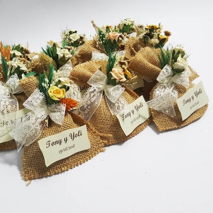 Elaboración: Saco lleno de flor lavanda decorado con blonda y un ramillete de flor seca con los tallos cintados con blonda beige y cordón dorado.