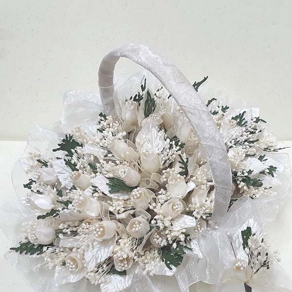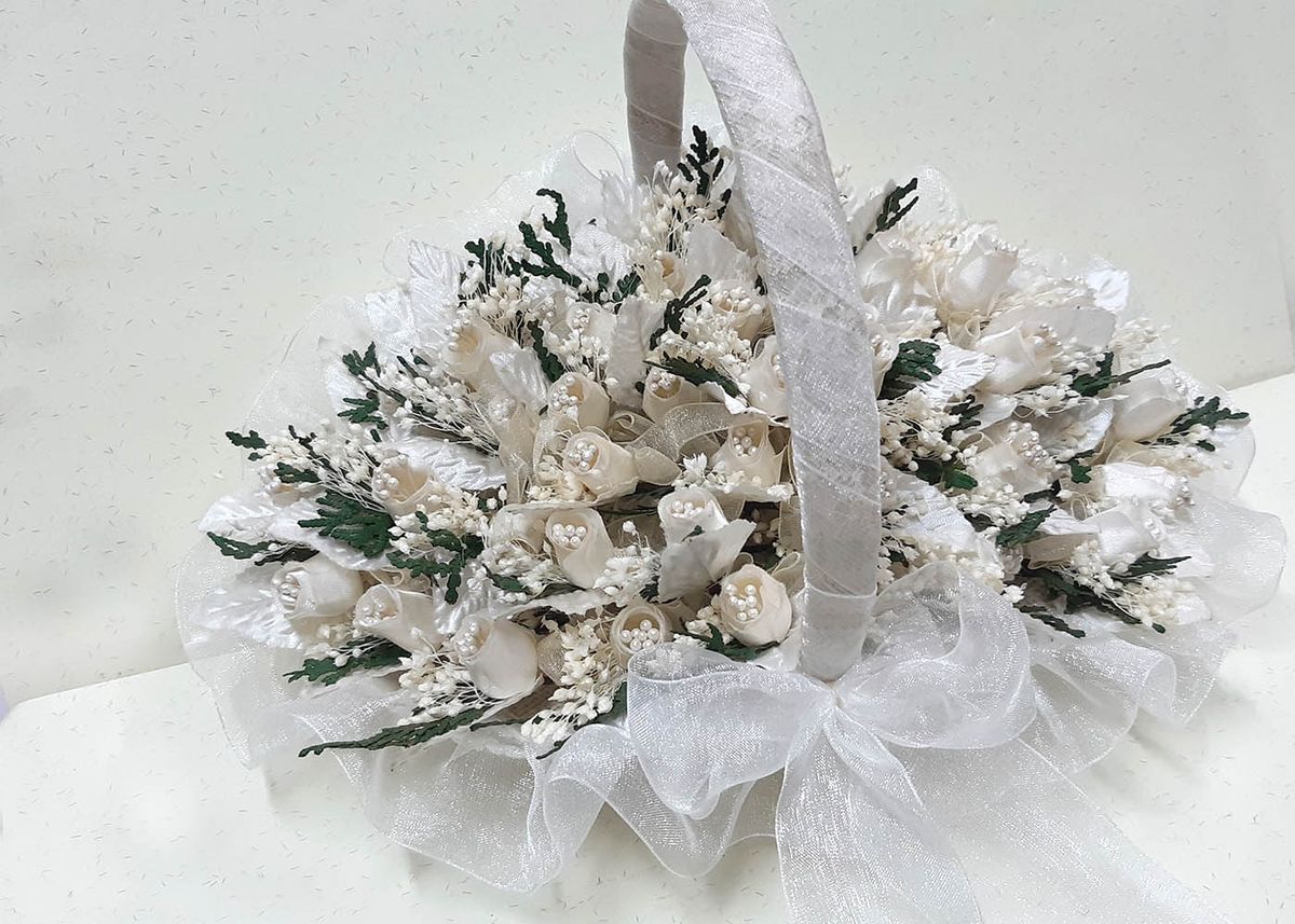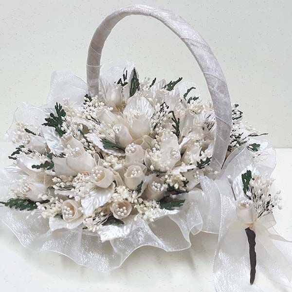 Cesta para llevar los detalles o los alfileres de novia. Una opción para sorprender tus invitadas regalando un alfiler con flor seca. Las cestas forradas y con acabados perfectos.