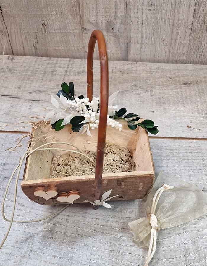 Las flores preservadas en colores neutros y brillantes, con vida. Nuestros clientes ya lo saben, todo el proceso se realiza en nuestro taller de Abril Dissenys totalmente personalizado para ti. Los anillos atados en la cesta de tronco natural a la que añadimos una bolsita de muselina para poner las arras y depositar la bolsa dentro de la cesta de boda, con el tamaño es ideal para las manos de los niños.