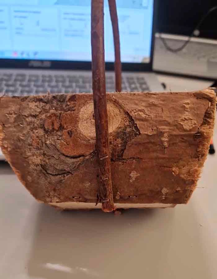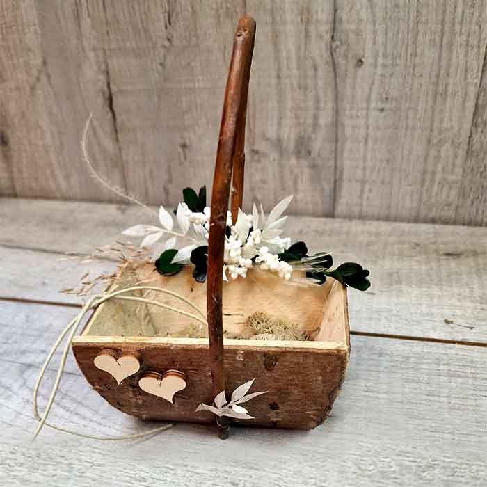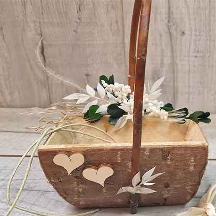 Cestas Boda Jazmín. Compra la cesta más original, realizada con leña recién cortada con troncos de madera rústica sin pulir, para llevar las alianzas y las arras al altar estén bien seguras, además, la cesta están decoradas con flores preservadas en colores neutros, como el blanco jazmín y verde natural, también, puedes pedirnos tu ramo de novia a conjunto.