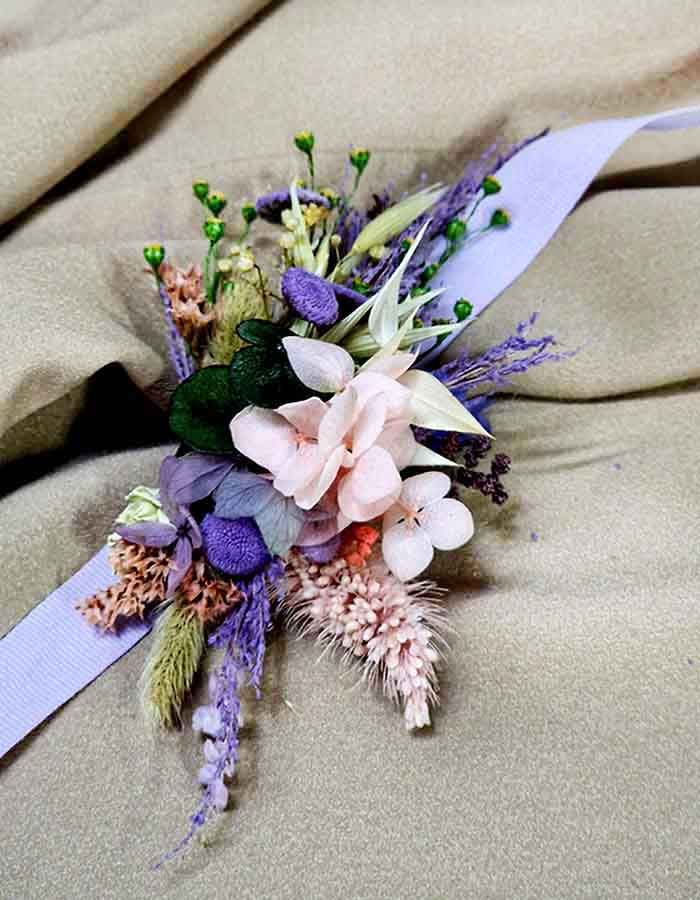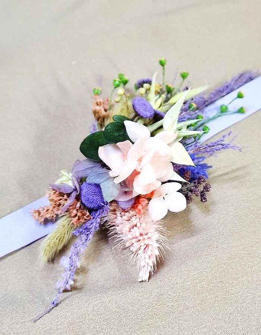 La frescura e intensidad de los colores vibrantes destacan a simple vista sobre estas flores para la cintura, la fuerza del lila y lavanda hacen que la puedas lucir en diferentes ocasiones o estilos, perfecta para bodas al aire libre, bodas rústicas, boho chic, campestres... dale un toque único al look de tu niña de arras o comunión, realizada artesanalmente en nuestro taller.