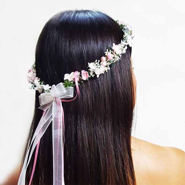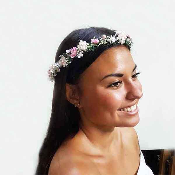 Ideal para todas las edades, ya que se adapta perfectamente a la cabeza con una lazada de muselina. Para niñas de arras y damas de honor, el adorno floral más adecuado es el que se hace con miosotis en dos colores. La corona de flores es el adorno por excelencia y muy fácil de llevar todo el día y estar perfecta.