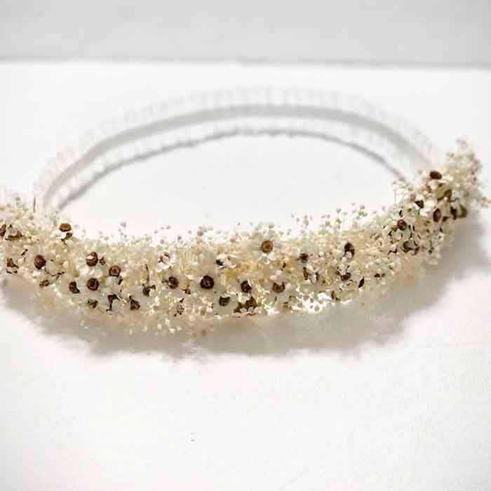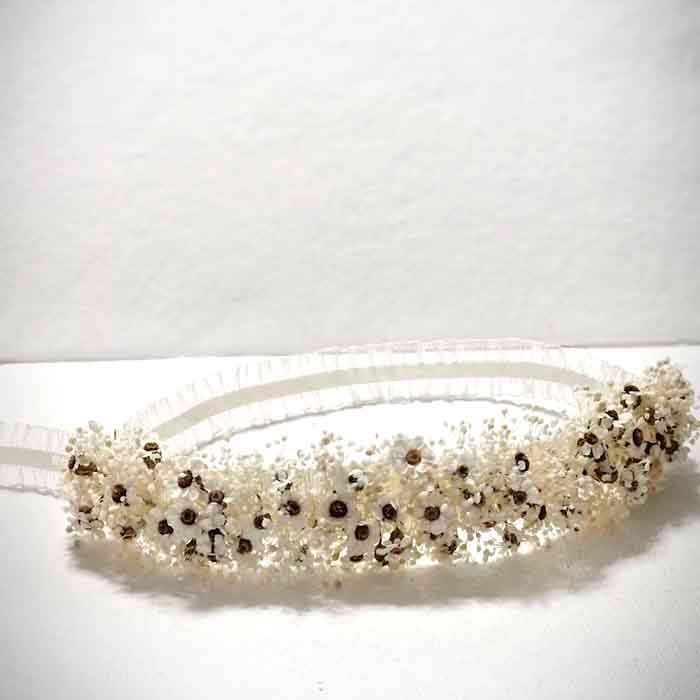 Trabajado sobré una cinta de muselina cubriéndola con un tapiz de flores de paniculata y margaritas preservadas, todo en color blanco o blanco roto, a fin de adornar el pelo de tu bebita o niñas de arras, damitas de honor, niñas de comunión desde los 0 a... años. Especiales para novias o invitadas, especial para lucirlo en las fiestas más importantes de tu vida.Por su versatilidad es perfecto para vestidos de novia creativos o invitadas. Los Tocados