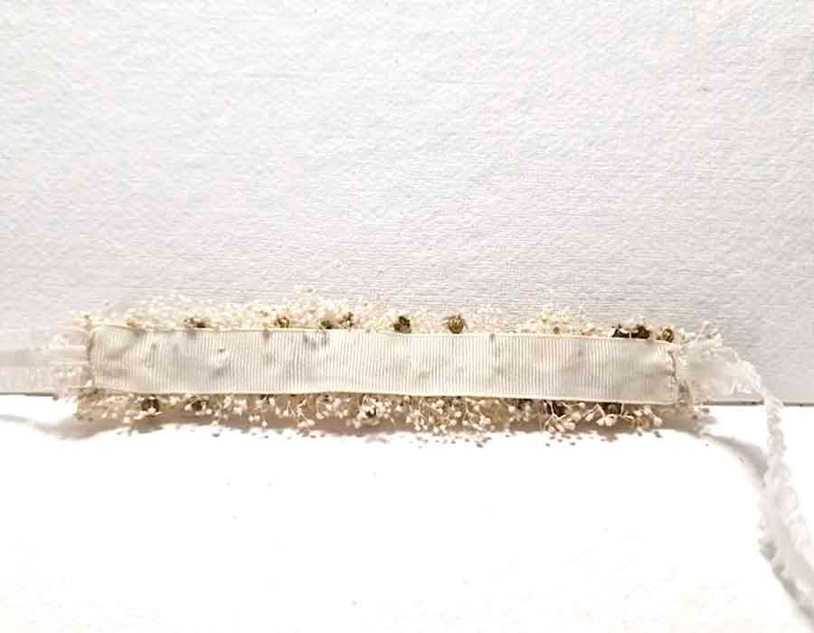 - Elaborado con: Margaritas y paniculata natural preservada, sobre una cinta que facilita con 4 puntos de costura para fijarlo justo donde lo necesites.