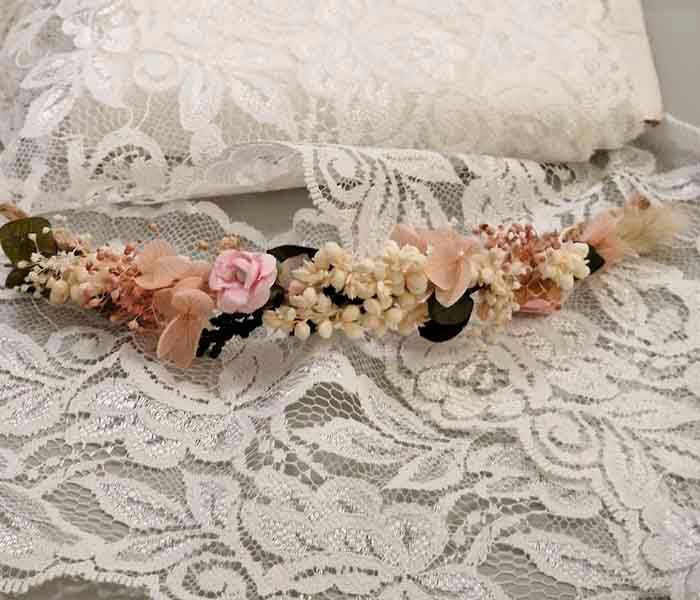 Gama de colores neutros, blanco, cava, natural, de diferentes intensidades. Flores preservadas, hecha a mano en el taller de Abril Dissenys. Realizada con nuestro sistema del trenzado de flores, lo que nos asegura que podrás lucirla tantas veces como quieras, dando siempre un toque especial a tu peinado.