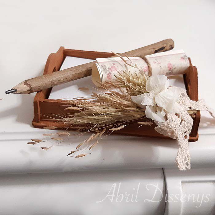 Lo personalizamos con los nombres y fecha sobre la primera hoja del bloc, comunícate con nosotros o escríbenos una nota en el pedido con los nombres y fecha.Si prefieres los mini pergaminos, pídelos aquí.Para pedir pergaminos:https://www.abrildissenys.com/regalos-y-detalles-invitados/detalles-para-bodas-y-comuniones/ramilletes-de-flores-para-decorar/pergamino-personalizado-de-agradecimiento10-unid/Colección: ArenaProducto: Taquillón de marquetería con taco papel notasColor: Nogal, natural según foto,Forma: RectangularTamaños: 11,5 x 9,5 x 3,5 cmPara pedir pergaminos:https://www.abrildissenys.com/regalos-y-detalles-invitados/detalles-para-bodas-y-comuniones/ramilletes-de-flores-para-decorar/pergamino-personalizado-de-agradecimiento10-unid/Elaborado con: Taco de papel para notas, lápiz hecho a mano. Flores secas y preservadas, Brisa Aire, Brisa máxima, Phleum, Phalaris, Bloom, Hortensia natural, liofilizada en tonos natural a marrones claros, atados con blonda de algodón