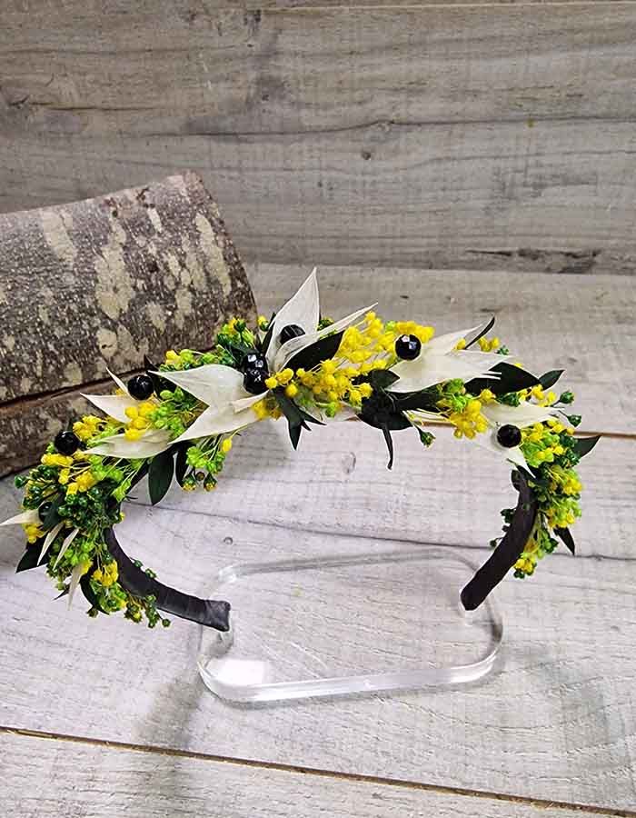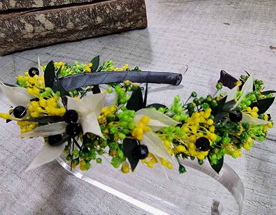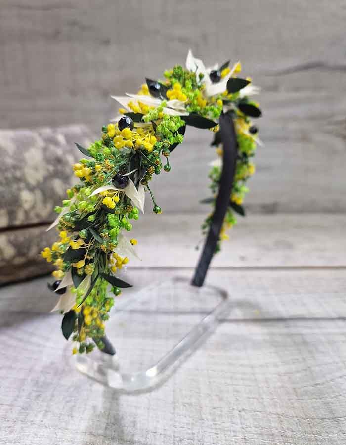 Esta diadema de flores preservadas es una pieza exclusiva diseñada para aquellas invitadas que buscan destacar con elegancia y un toque vibrante. Su diseño equilibrado combina la frescura de los tonos pistacho (amarillo y verde) con sutiles hojas blancas, creando un contraste natural que ilumina el rostro.