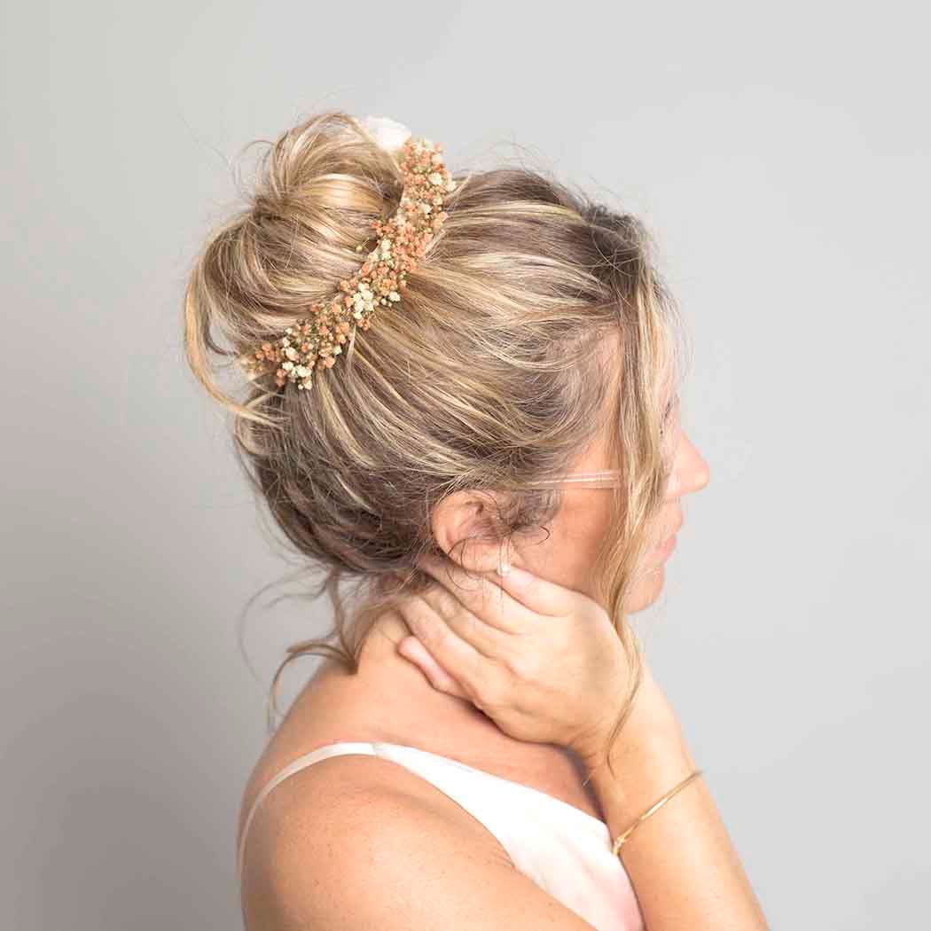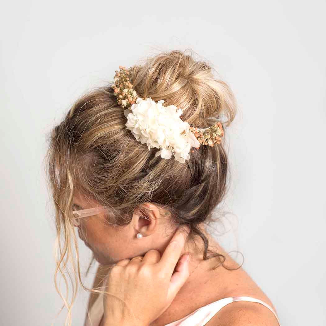 Entendemos que un evento largo requiere comodidad. Por eso, la diadema está montada sobre una base fina y flexible que garantiza una sujeción perfecta sin oprimir, adaptándose a peinados sueltos, con ondas o recogidos. Al ser flores preservadas de alta calidad, tu diadema se mantendrá impecable durante años.