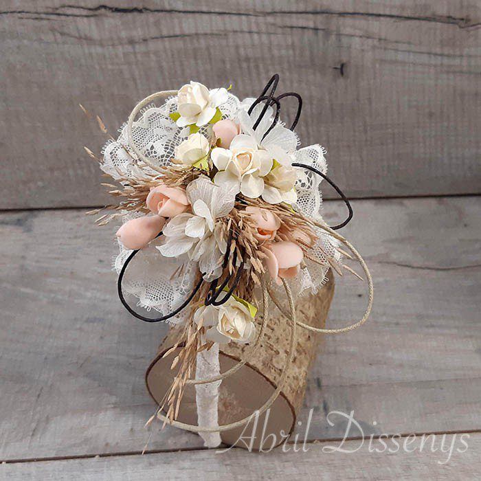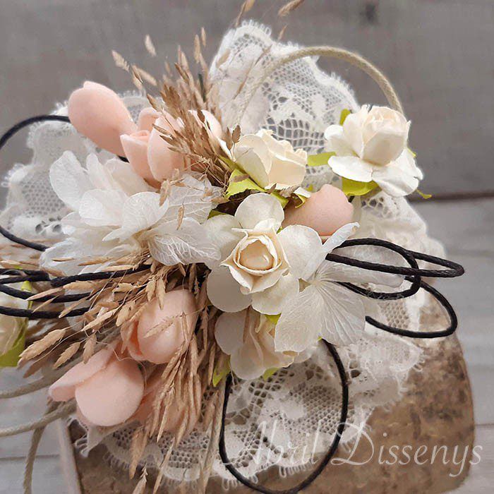 - Elaboración: Diadema forrada con encaje blanco. Flor seca como la hortensia, blomme y brisa aire. Tulipán, de foam, rosas de papel natural de, cordeles y pistilos. Escarapela de encaje fino.