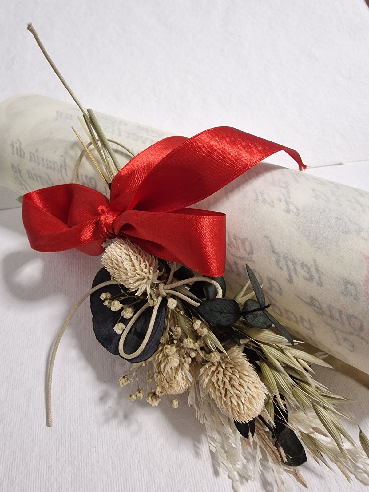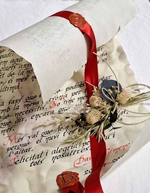 Acabados: Escritura artesanal con plumilla, flores secas, lacre AD.