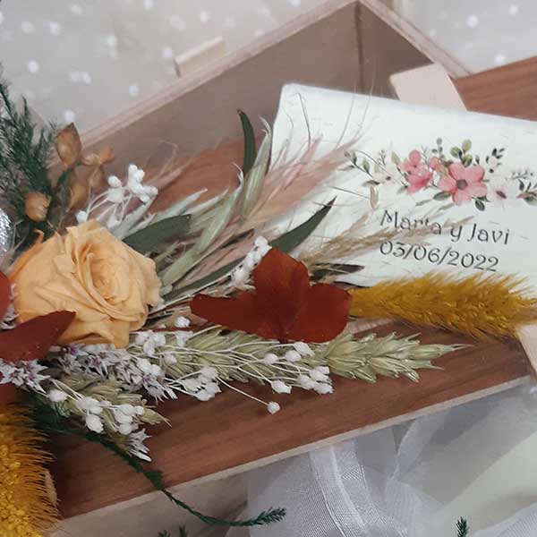 Poesía con caja de madera y Flores. Comprar esta caja de madera para la presentación y tu pergamino con los votos de los novios hará que este momento sea inolvidable, un recuerdo para la vida, la presentación del pergamino en tamaño A 3 enrollado y atado con lazada y flores a juego con la caja con flores secas y preservadas, caja de color natural de la madera destaca con los colores de la decoración que tú elijas,