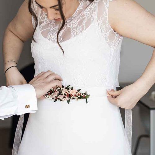 Diseñamos el ramo, el tocado y el cinturón a juego para lograr una armonía total en tu estilismo.