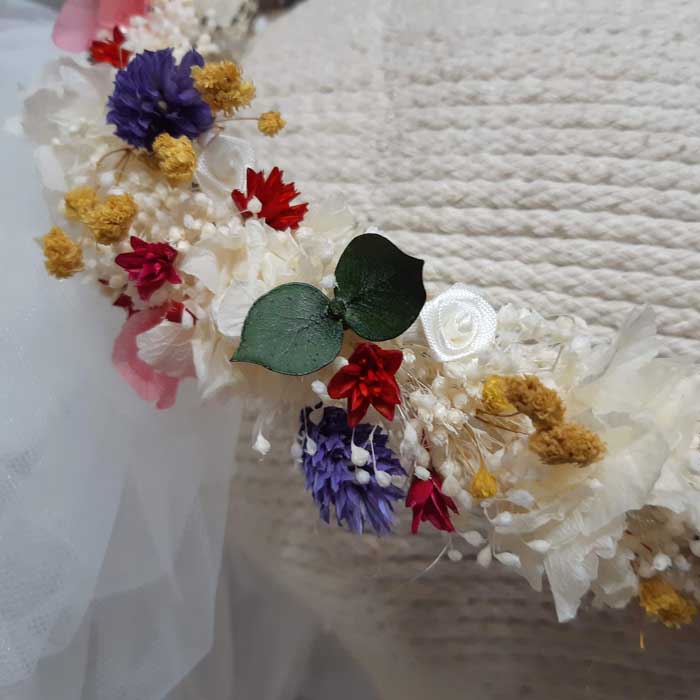 Corona Pelo Multicolor Alba. La primavera ha llegado a nuestra colección de coronas, una multitud de colores nos inundan y hacen que esta preciosa corona sea tan versátil para combinar con diferentes looks. Las flores naturales preservadas de vivos y alegres colores, elaboradas a mano con paniculata preservada, tres colores de hortensias, eucaliptus, gripsofila, botone, poa y peonías.