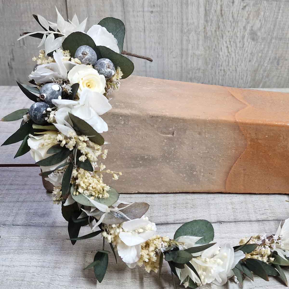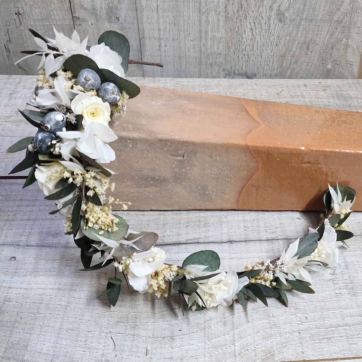 Tocado Semi Corona Edurne. Flores en el pelo para el día de tu boda espectacular corona, tocado en trenzado de flores blancas y chantillí con verde. Un tocado muy versátil, para que en tu boda puedas lucir segura y exuberante, tiene forma de trenza, para que tu peluquera podrá moldear en tu peinado dándole color y luz. Colores neutros, blanco y verdes, flores naturales y preservadas de plena actualidad en este año 2023.
