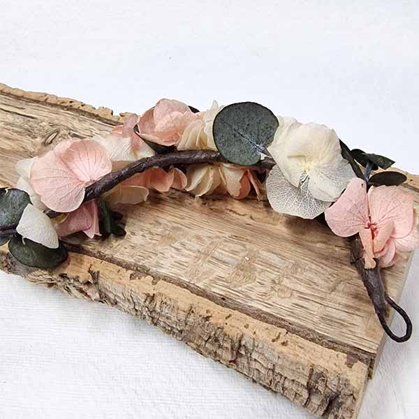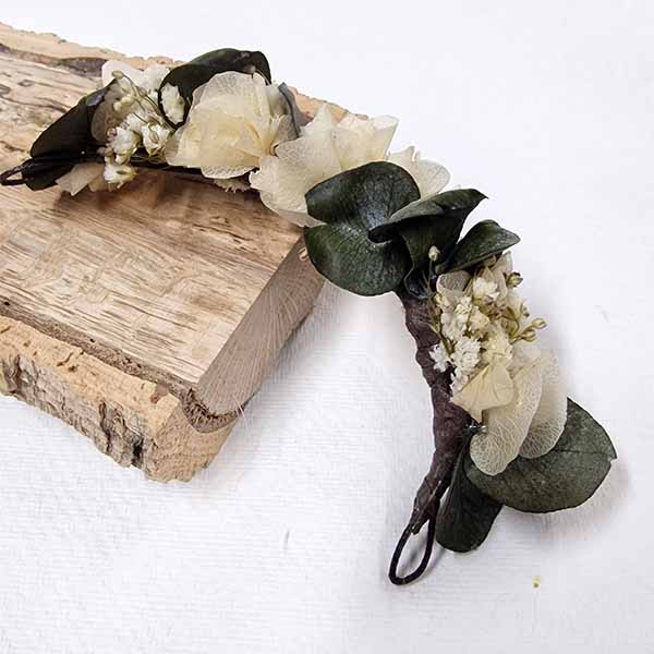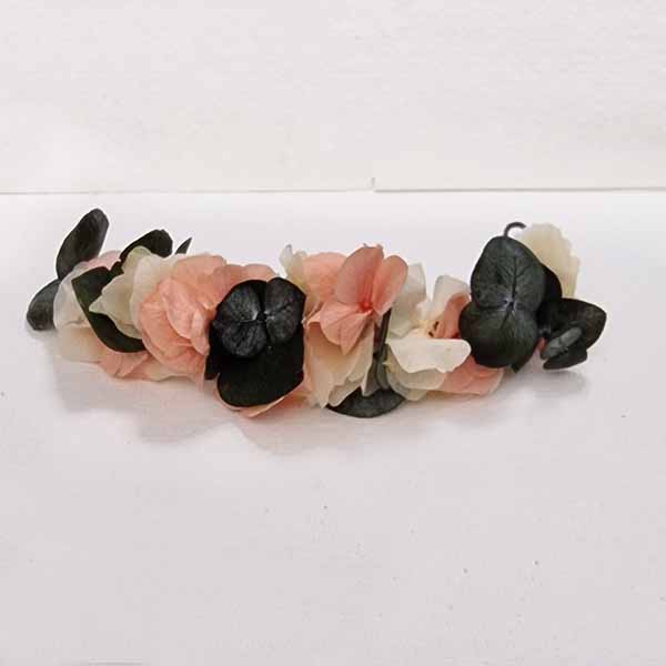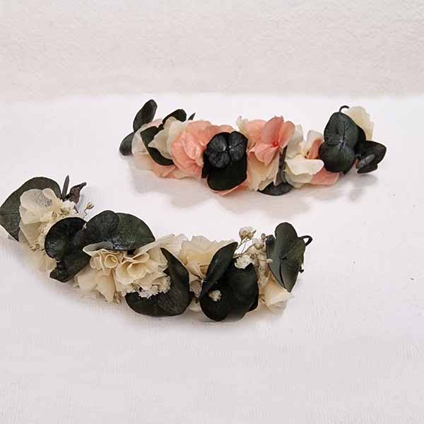 Coletero de Flores Selene. Flores en las colas del pelo para bodas. 10 Centímetros de puro arte para las divertidas coletas o trenzas de inspiradas en las diosas griegas que hacen que te sientas así, una diosa, ponte flores en el pelo si eres la novia o la invitada más envidiada, para las ceremonias del 2023 -24, piensa en flores preservadas un tocado de flores trenzadas en forma curvada hechos expresamente para abrazar la trenza de tu cabello, abrazando tu cabello recogido creando la forma que más te favorezca, flores para el pelo, trenzas, moños o colas que están tan de moda en la actualidad. Coletero de Flores Selene