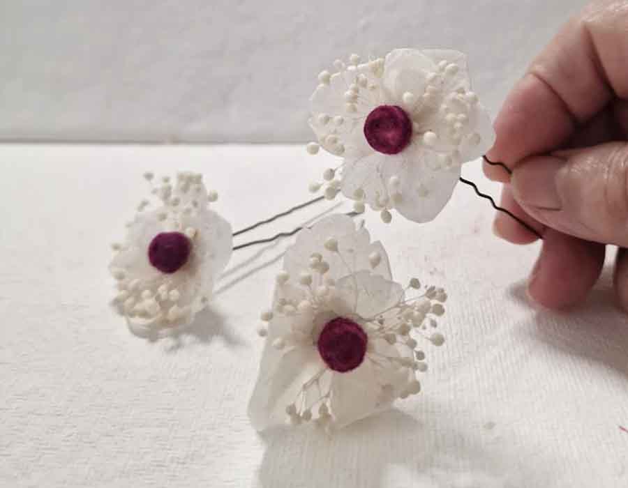 Con las flores preservadas, trending topic mundial, la hortensia y la paniculata, acabando con una perla central, ideales para novias o invitadas, las puedes pedir en diferentes colores, combinando con tu vestido, resaltando así tu peinado.
