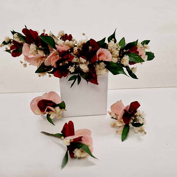 Flores naturales preservadas y secas que se utilizan para la colección Cibeles son: La hortensia es de dos colores: Paniculada, Eucaliptus verde natural. De un efecto fresco y colorido, con la ventaja de mantenerse en un estado perfecto durante mucho tiempo, conservando su belleza. Una vez finalizado el evento. No exponerlo al sol ni a la humedad.