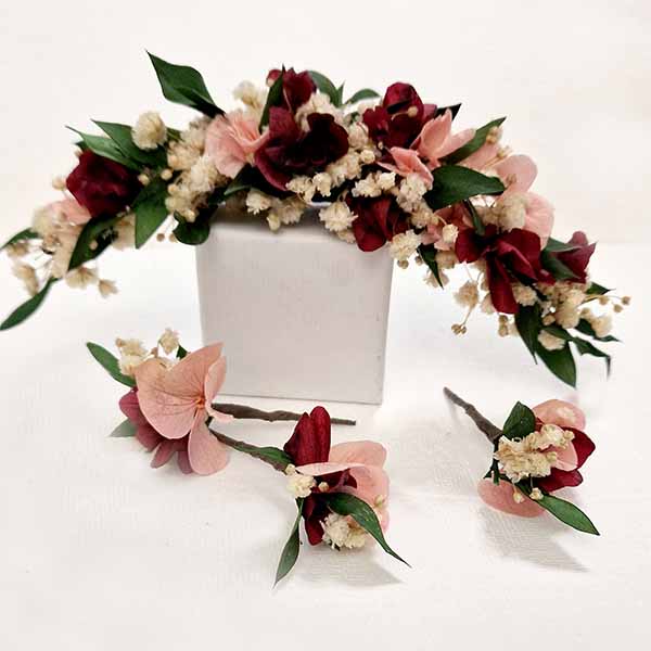 El tocado de la novia o de las invitadas, de suaves colores del blanco roto, la hortensia rosa y burdeos y el galceran verde, nos ofrecen un fuerte colorido adaptable a ti. Los pequeños toques de flores crean este precioso tocado multicolor, por todo ello y nuestro trabajo forma este bonito tocado para ir de boda.