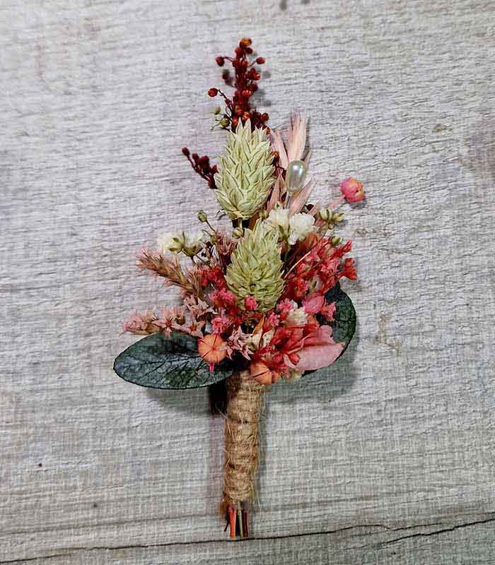Flores para Solapas de Hombres. Las flores para la solapa de los hombres de la boda a conjunto con el ramo de la novia, ideal para bodas del 2024, donde las flores secas y preservadas siguen en auge
