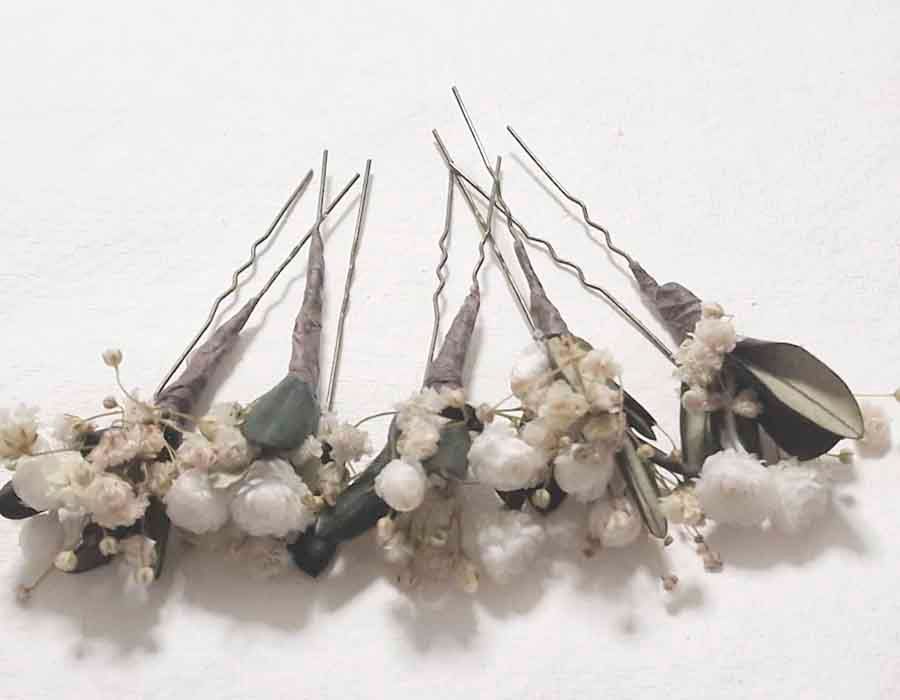 Horquillas de flor de olivo para el pelo. El color verde olivo natural preservado con su y las flores de siempreviva y gripsofila blanca. Las flores perfectas para el día de la boda: el color blanco de las flores de siempreviva y los neutros de la gripsofila natural preservada lo convierten en un mini ramillete de flores de colores neutros para novias muy naturales y elegantes. Flor de Olivo para el Pelo con Horquillas
