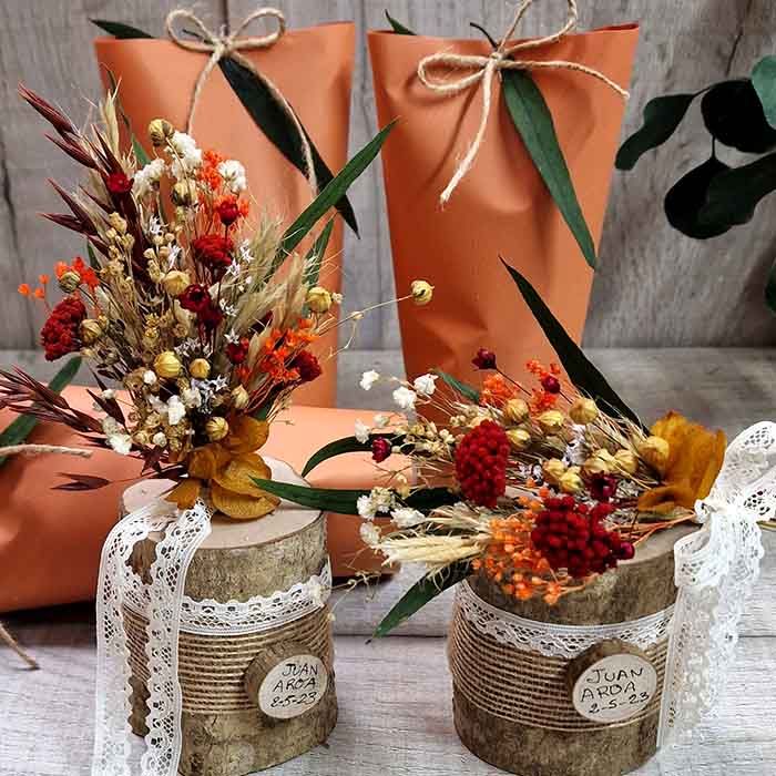 Flores preservadas para invitadosJarrón Madera Flores Detallazos. Es una excelente idea para detalles de invitados, tiene un toque vintage y está elaborado a mano con flores secas envueltas en yute y lazo de encaje. Son regalitos originales para una invitada de bodas, bautizos o comuniones. Producto: Jarrón Madera Flores Detallazos Elaborados con. Flores secas y preservadas en colores surtidos: Rosa, fucsia, azul, marrón, amarillo, blanco, salmón. Envoltorio con papel regalo Personalización a mano: En rodaja de madera Solo las iniciales y la fecha escritas a mano. Forma: Según foto Tamaño total: 22 X 10: Flores secas, surtidas, se puede escoger el color de la flor. Tatarica, blomme, phalaris, hortensia, sorgo, avena, rositas, paniculata