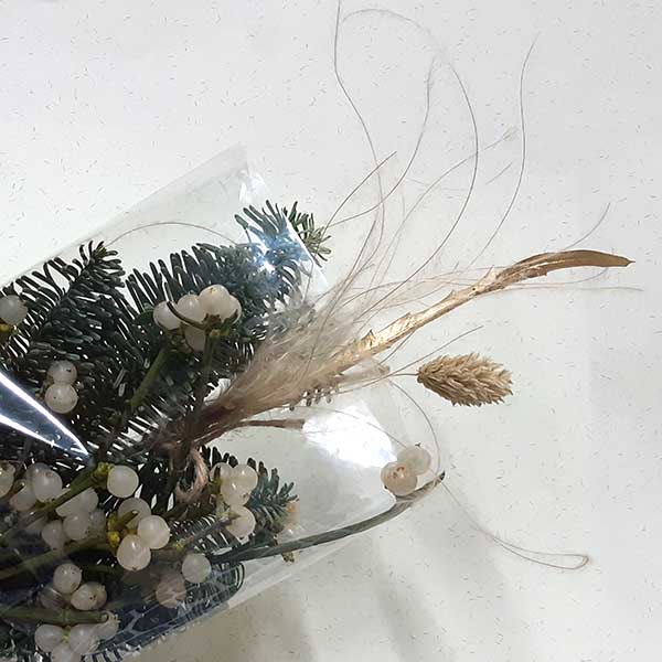 de muérdago Fresco:** Contiene muérdago, flores y abeto, rodeado de celofán y lazo listo para regalar.