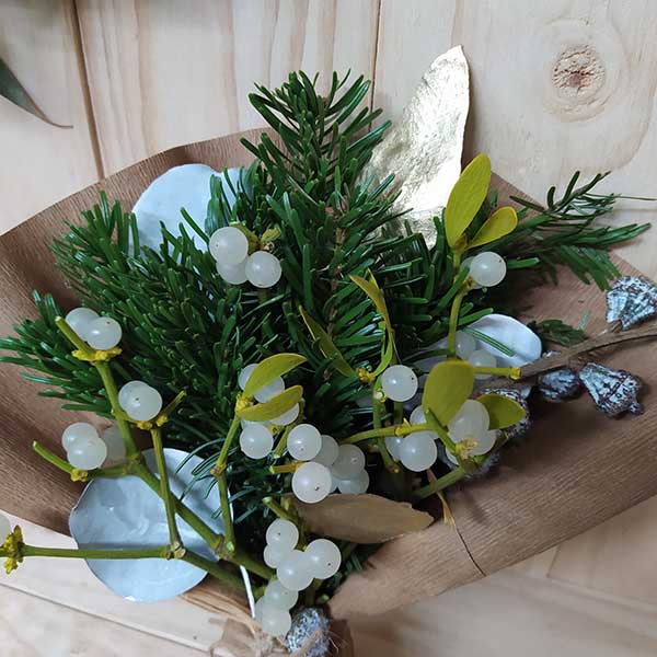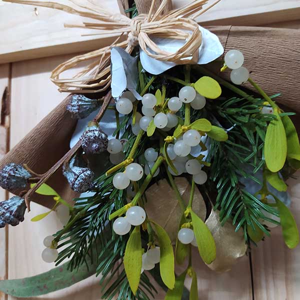 Ramo Rústico con Muérdago. Comprar un ramo de muérdago con hojas, monedas de oro para regalar, es un acto de amor y generosidad que se los hace a nuestros seres estimados, puesto que es el momento en que se recolecta esta flor, también dicha la flor de la suerte o la flor del beso ya es tradición besar a los seres estimados bajo el muérdago.