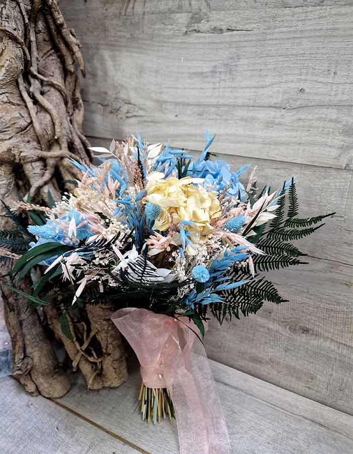 Ramo de Novia de Lauren. La sencillez y la elegancia del ramo de la novia dice mucho de ti, elegir las flores eternas silvestres y preservadas es la mejor opción con ellas te sentirás segura y perfecta, los colores neutros y nude son perfectos para las novias de estilo romántico y naturales, el color brillante y natural de la eterna, combinada con los helechos verde oscuro que las hacen resaltar, los tallos de flor de las diferentes flores que sobre una base de tatarica natural que son los colores predominantes de este ramo.