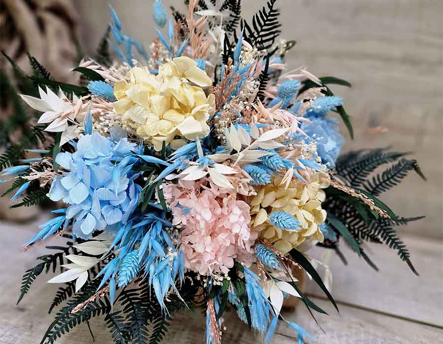 - El color brillante y natural de las eternas hortensias envueltas con las hojas de helecho gigante y que le aporta la diferencia a este ramo.