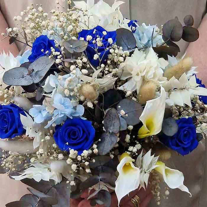El color principal es la luz, la luz que desprende este ramo con 1 gran rosa en color azul celesta o azul intenso, diferentes tonos de blanco, con hortensia, el color secundario es el verde que aporta elegancia y naturalidad a ramo, el verde del eucaliptus que no puede faltar en este precioso ramo. Una rosa grande, gipsófila preservada, galceran blanco preservado, hortensia preservada en blanco y rojo, eucaliptus verde, avena y tacida natural.