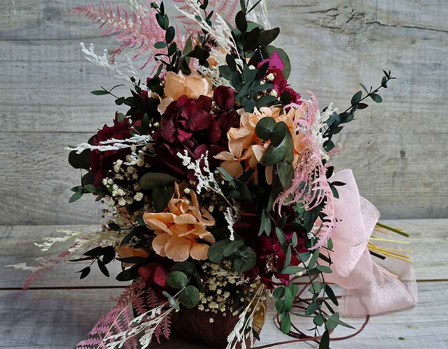 Ramo Novia Cibeles. Un exuberante ramo para novias, ideal para bodas del 2024, donde las flores secas y preservadas, ya que siguen en auge. Un ramo grande espléndido hecho para lucirlo, las novias más atrevidas, con flores naturales, secas y preservadas, como la hortensia con colores, rosa, burdeos, verdes, todos en diferentes escalas de colores, también los neutros como el blanco y cava destacan por su elegancia.