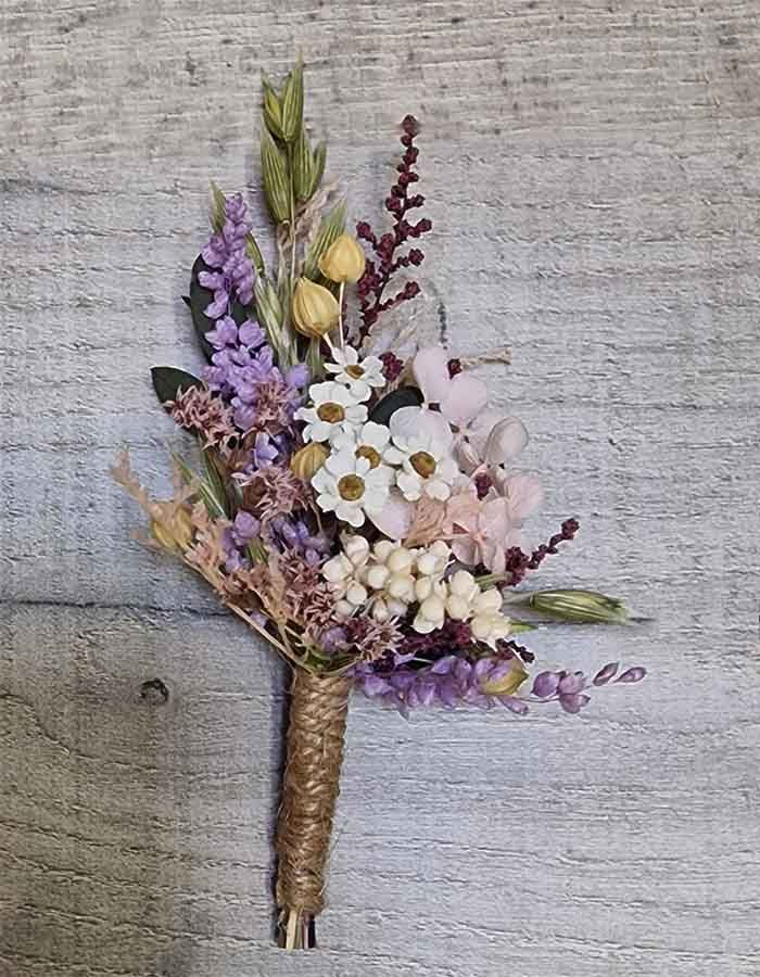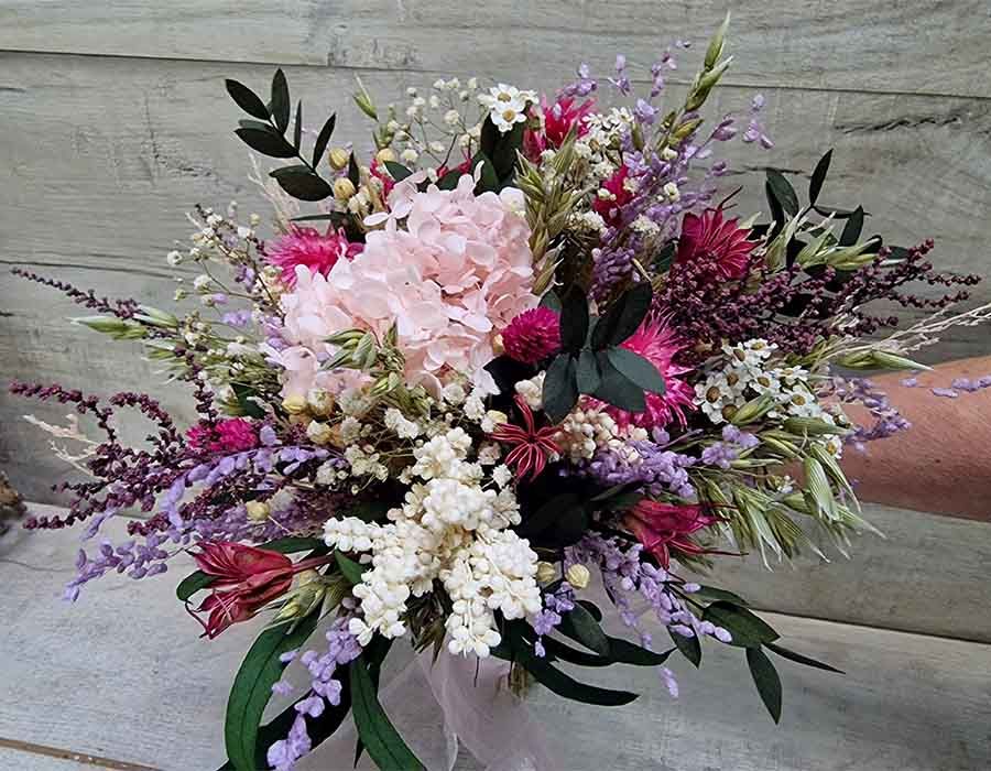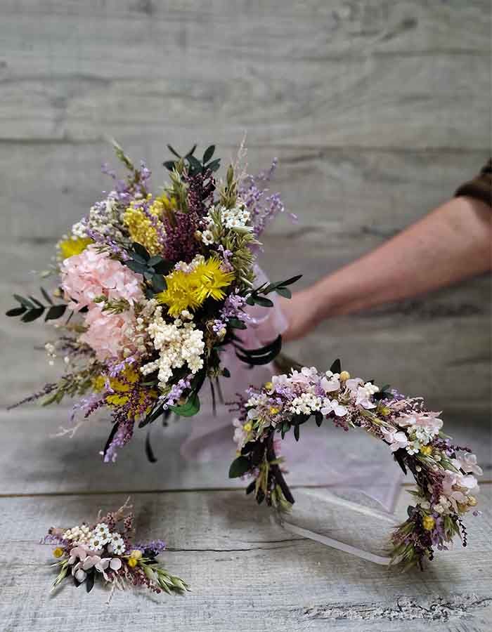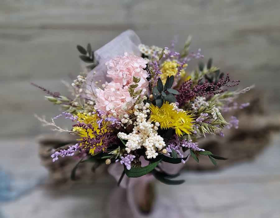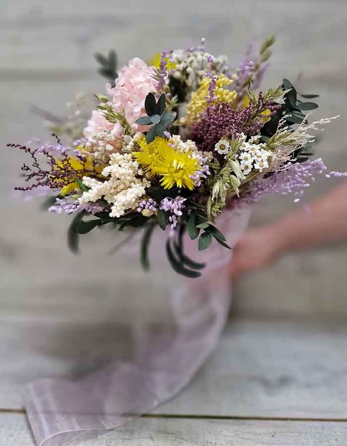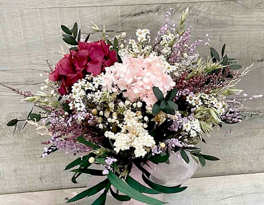 Flores de colección: Trabajamos con poa, tatarica, elicrisum, eucalipto, hortensia, flor de cera blanca, sorgo y avena. Flores que mantienen su frescura visual y color durante años.