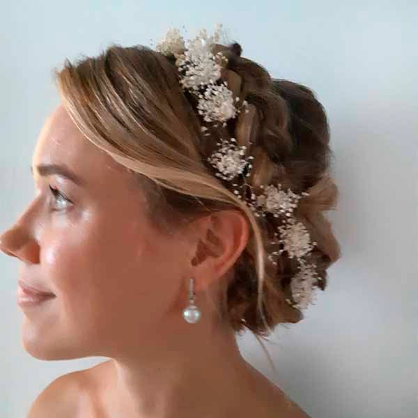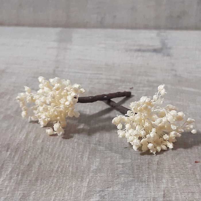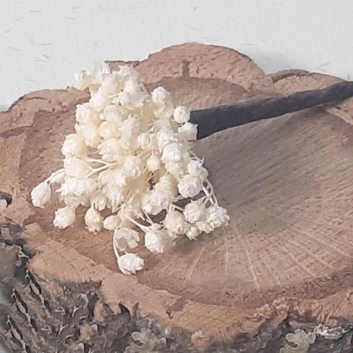 Pin de pelo conflor preservada, natural y elegante, aportando un toque de luz a tu peinado. Está hecho a mano con paniculata y con tallo forrado tapé marrón.