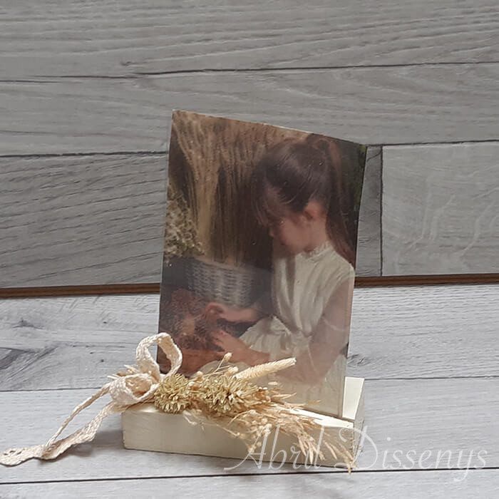 Elaborado con: Pieza de madera pintada a mano con ranura para colocar la foto. Decoración de flor seca hecha a mano con hortensia natural liofilizada, brisa aire, brisa máxima, bloom y lazo de puntilla.