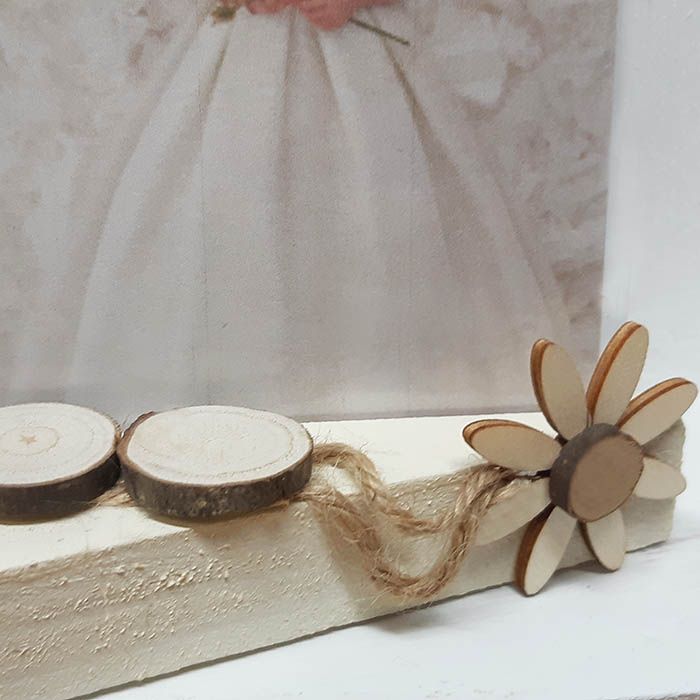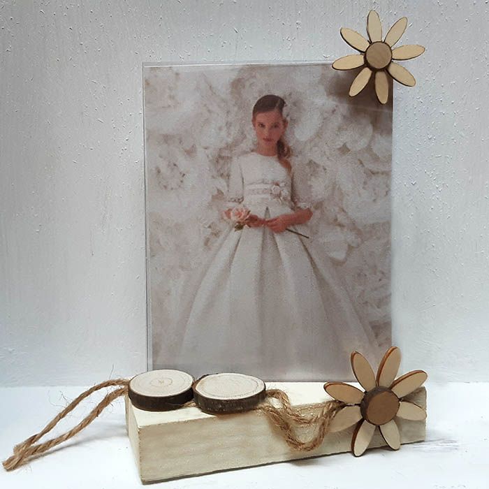 Gratis personalizar este producto, escribe en el pedido los nombres y fechas del eventoColección:Retales del bosqueProducto:Portafotos margaritasColores:Según fotosTamaños: 11 largos X 4 ancho cm 14 de alto (Tamaño foto 9 x 13)Elaborados con: adornos de maderaTiendas de bodas online
